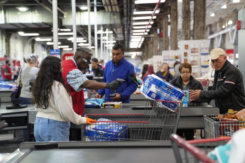 4月10日,人们在美国纽约一家超市购买生活用品。新华社记者张凤国摄