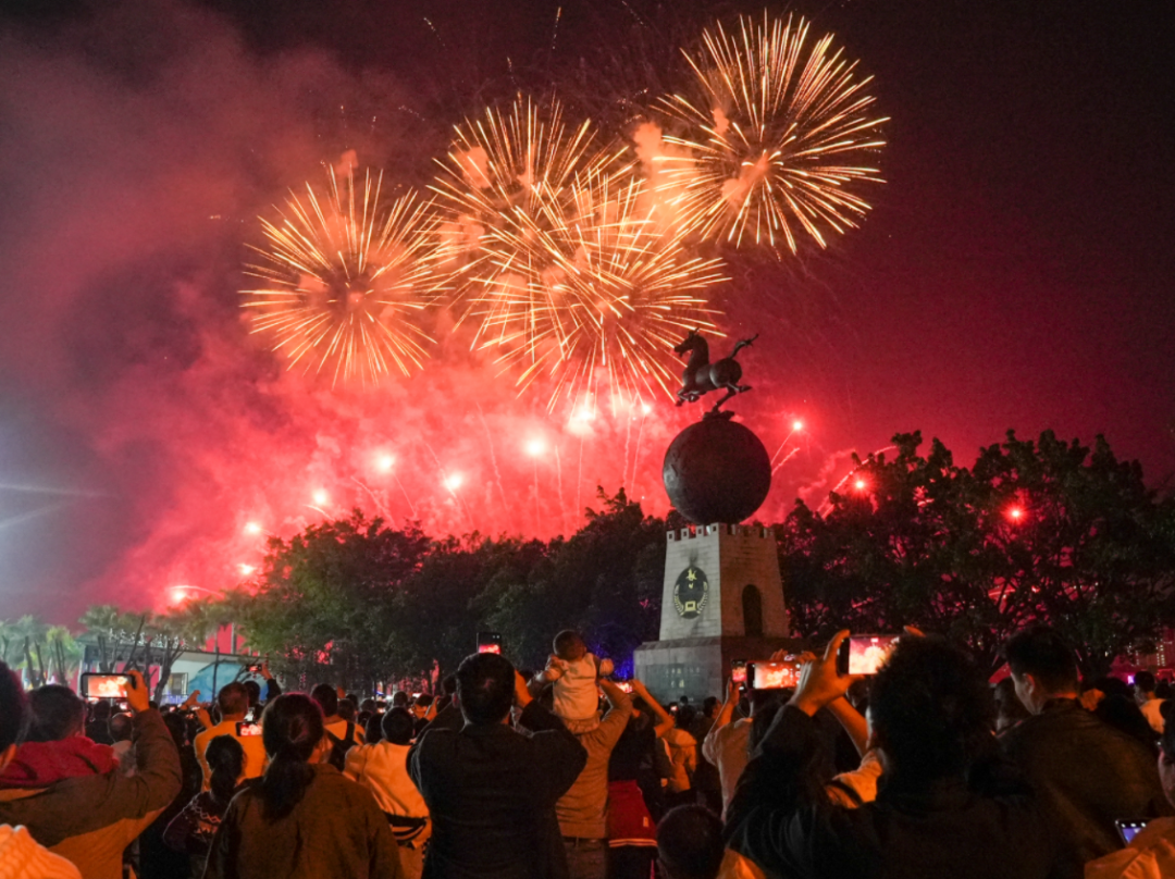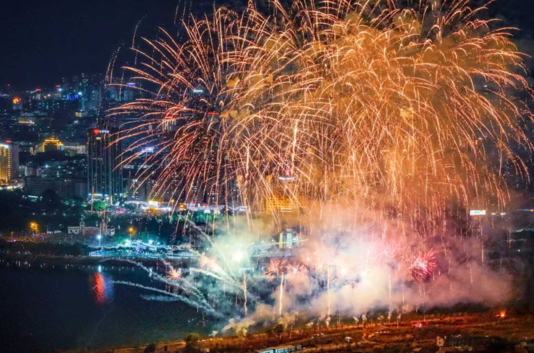 当晚8时许,随着第一束焰火腾空而起,深邃夜空瞬间被点亮,焰火秀正式拉开帷幕,四大主题篇章依次精彩呈现。