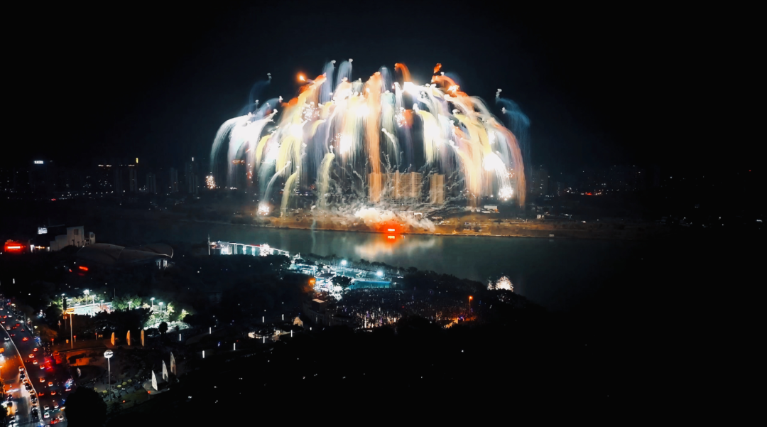 整场表演依托两江交汇地形轮廓精心编排,总时长约20分钟。金色、红色、紫色、蓝色的烟花次第绽放,时而如繁花盛开,时而如流星划过,时而如瀑布倾泻,层层叠叠、高低错落,在夜空中勾勒出一幅幅壮美画卷。
