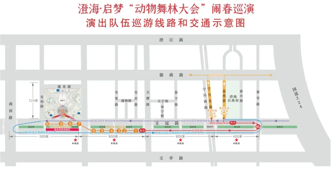 10支动物舞蹈队伍在奥飞市民广场音乐厅前圆埕进行集体亮相,并逐一进行展演。每支队伍展演结束后即退场行进至文冠路(怀汉路口至玉潭路口)指定位置休整,做好巡游准备。